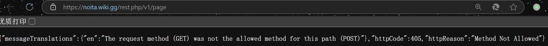 To check further and find the endpoint (usually the website's domain, like https://mediawiki.org/), check by going to base-url/rest.php/v1/page in a browser (like https://noita.wiki.gg/rest.php/v1/page) and see if the output looks right. If not, add '/w' to the base URL and try again.